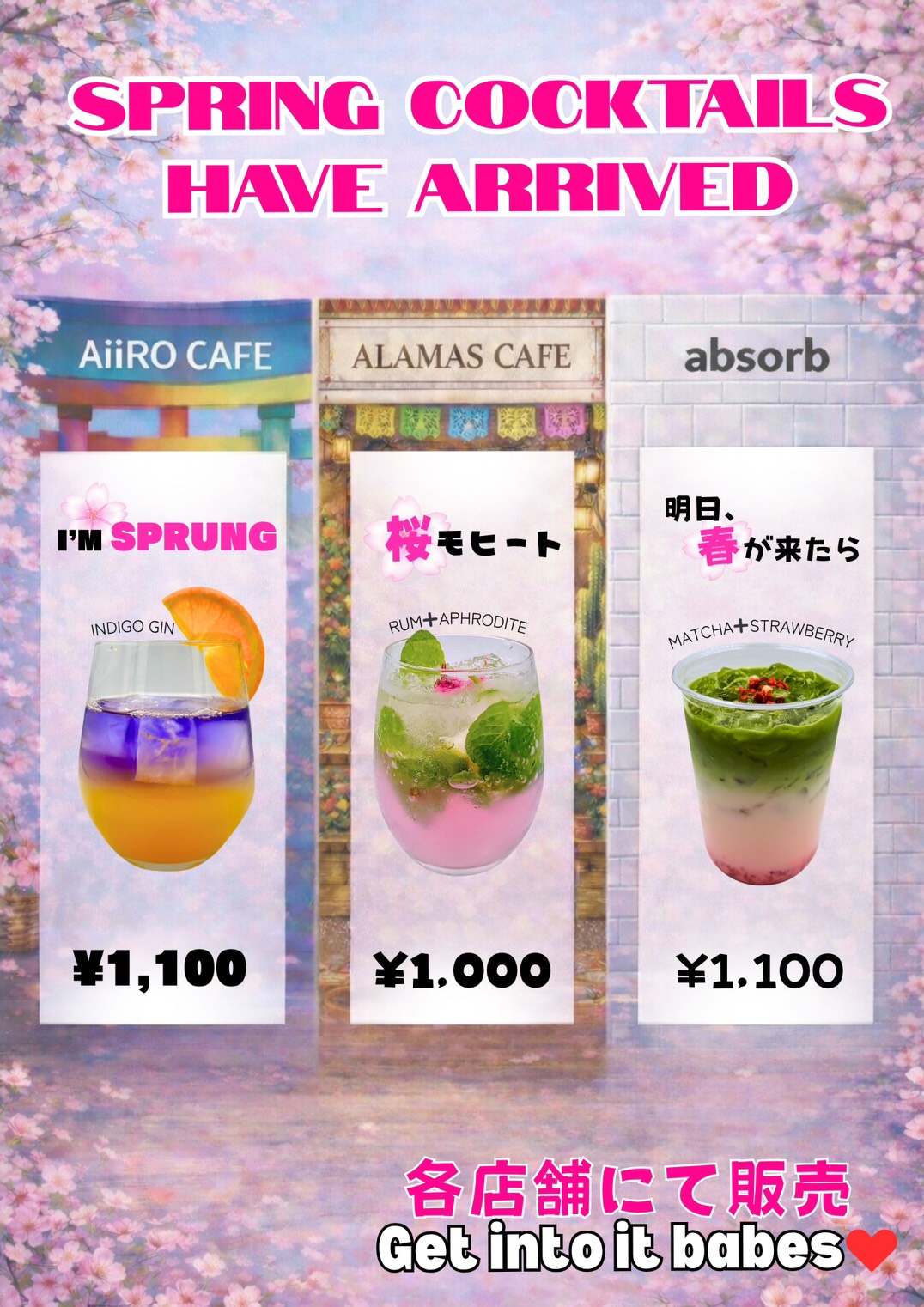 🌸 SPRING COCKTAILS HAVE ARRIVED !! 🌸 期間限定メニュー‼️ 系列3店舗で、特別な春の味をお届けします。 🤍 absorb『明日、春が来たら』¥1,100 🩷 ALAMAS CAFE『桜モヒート』 ¥1,000 💙 AiiRO CAFE『I’M SPRUNG』 ¥1,100 各店舗で皆様をお待ちしております✨ Tweet Share +1 Hatena Pocket RSS feedly Pin it 【3/2 START】ALAMAS CAFE「スタンプ…前の記事